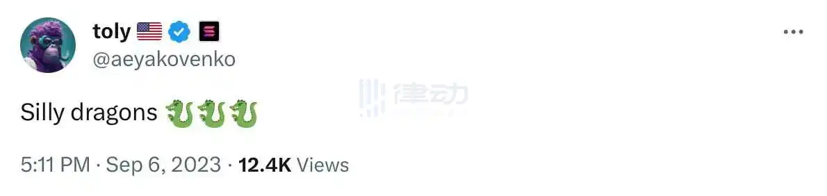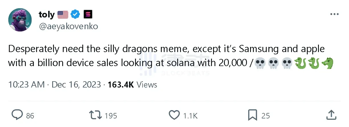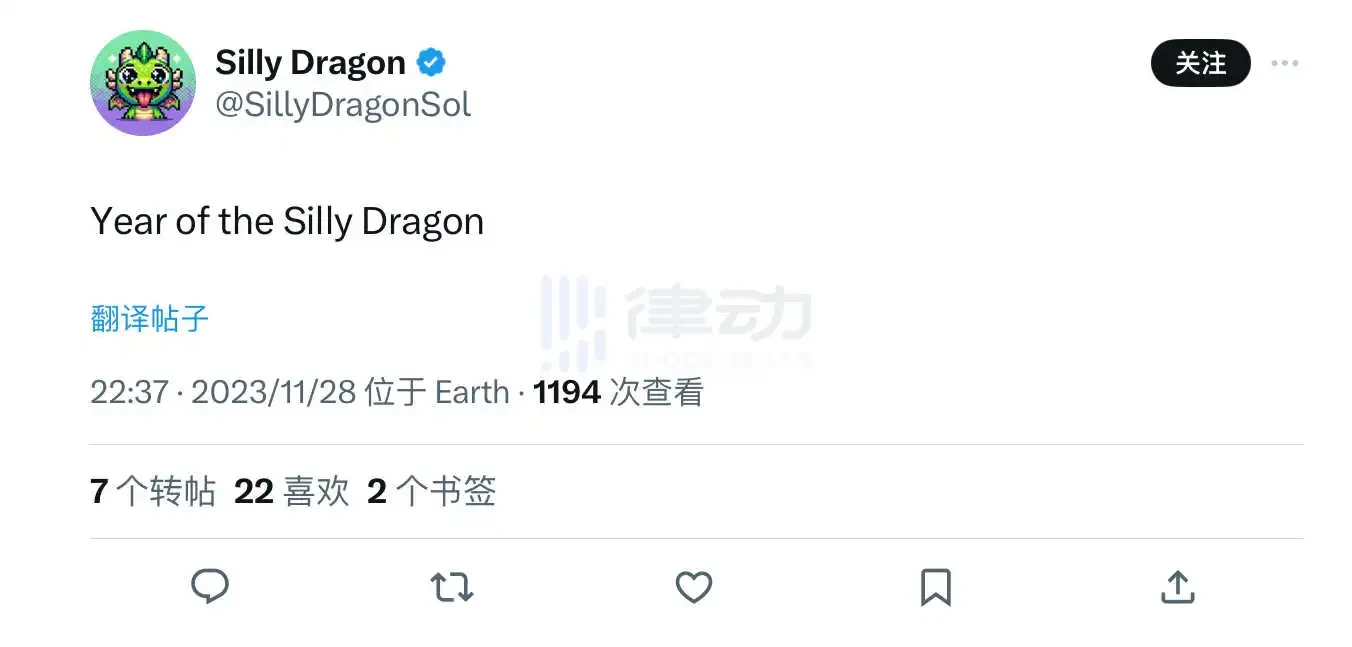 峰会后,Silly Dragon 这个形象也出现在了 Solana 社区里。11 月 8 日,Anatoly 在社交媒体平台 发文 「year of the silly dragon」(傻龙年),为 Solana 的叙事注入了新鲜而俏皮的能量。随着 2024 年的临近,这句话也恰巧对应了即将迎来的龙年,这波叙事在国内的社区中也更容易受到欢迎,人们对围绕这条愚蠢的龙可能展开的叙事和创新充满期待。