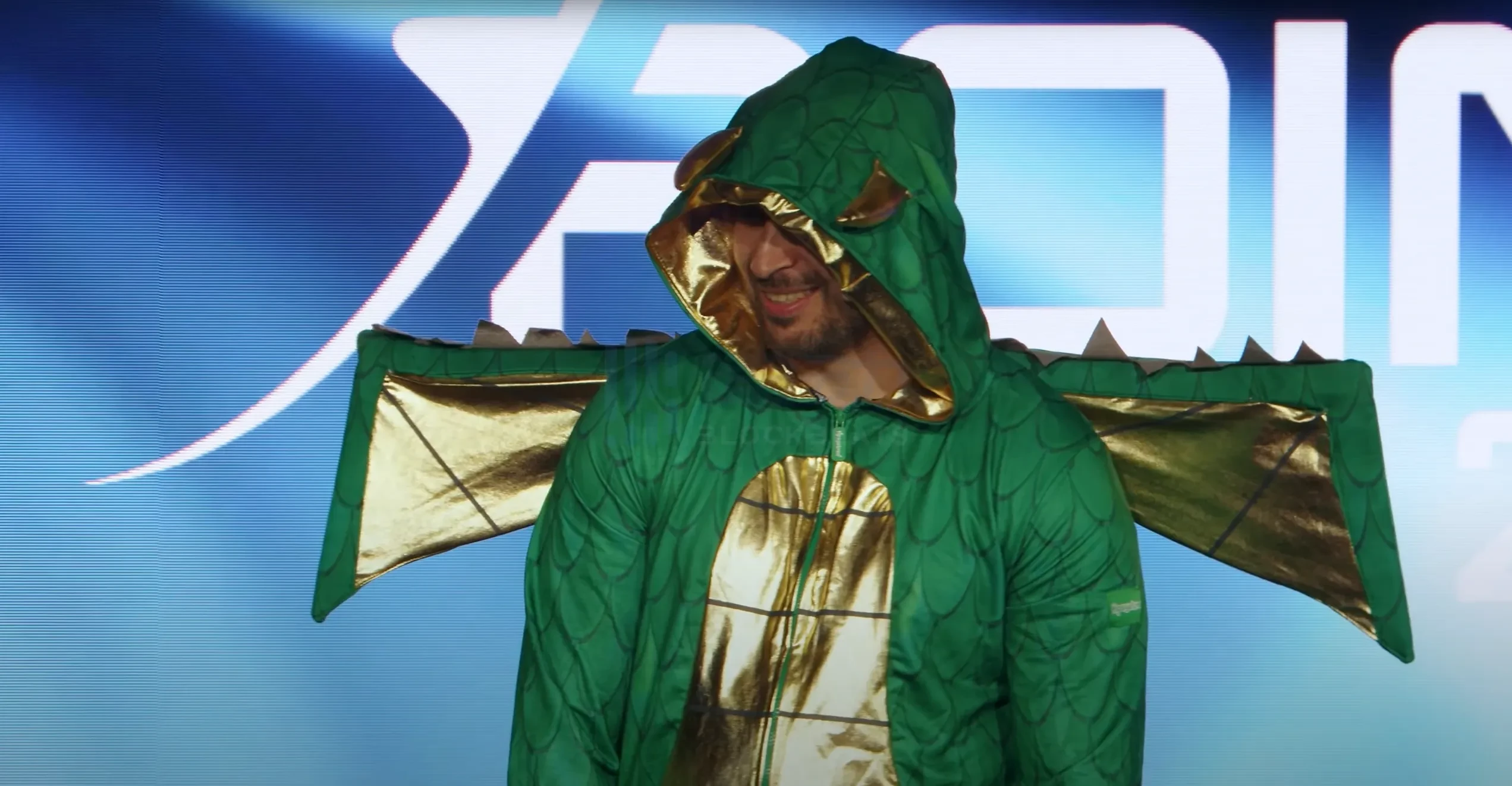 峰会开幕当日,正值西方万圣节当天,Anatoly 以一身绿色恐龙装扮出场,成为了峰会上最独特、最引人注目的存在。