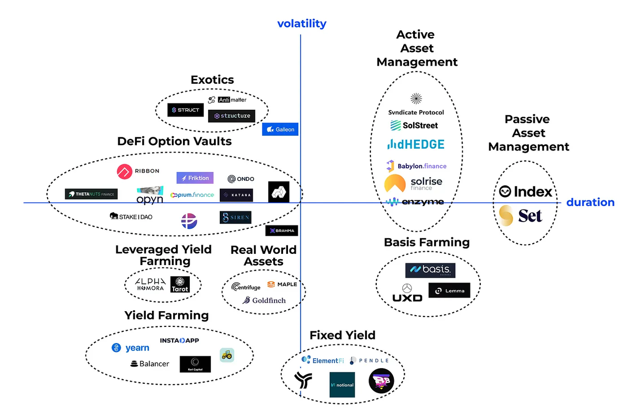 最初的加密结构化产品是所谓的DeFi期权库(DOVs)中。DOV(Decentralized Option Vaults)是链上期权库,用户可以在其中买卖期权。用户必须将代币锁定在库中,以防止他们的交易对手决定行权期权,以确保库的资金始终充足。DOV运行的最初策略是简单的看涨看跌期权策略,但投资者仍然面临 ETH 本身的价值下降的风险。DOV协议的发展方向是提供更多高级的金融衍生品,最终发展成为私人银行类产品的完整解决方案。