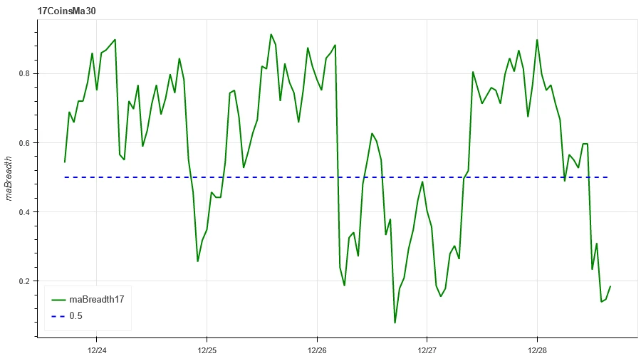 上图为['1000 floki', '1000 lunc', '1000 pepe', '1000 shib', '100 0x ec', ' 1inch ', 'aave', 'ada', 'agix', 'algo', 'ankr', 'ant', 'ape', 'apt', 'arb', 'ar', 'astr', 'atom', 'audio', 'avax', 'axs', 'bal', 'band', 'bat', 'bch', 'bigtime', 'blur', 'bnb', 'btc', 'celo', 'cfx', 'chz', 'ckb', 'comp', 'crv', 'cvx', 'cyber', 'dash', 'dgb', 'doge', 'dot', 'dydx', 'egld', 'enj', 'ens', 'eos','etc', 'eth', 'fet', 'fil', 'flow', 'ftm', 'fxs', 'gala', 'gmt', 'gmx', 'grt', 'hbar', 'hot', 'icp', 'icx', 'imx', 'inj', 'iost', 'iotx', 'jasmy', 'kava', 'klay', 'ksm', 'ldo', 'link', 'loom', 'lpt', 'lqty', 'lrc', 'ltc', 'luna 2', 'magic', 'mana', 'matic', 'meme', 'mina', 'mkr', 'near', 'neo', 'ocean', 'one', 'ont', 'op', 'pendle', 'qnt', 'qtum', 'rndr', 'rose', 'rune', 'rvn', 'sand', 'sei', 'sfp', 'skl', 'snx', 'sol', 'ssv', 'stg', 'storj', 'stx', 'sui', 'sushi', 'sxp', 'theta', 'tia', 'trx', 't', 'uma', 'uni', 'vet', 'waves', 'wld', 'woo', 'xem', 'xlm', 'xmr', 'xrp', 'xtz', 'yfi', 'zec', 'zen', 'zil', 'zrx’]在 30 日均线上方的占比