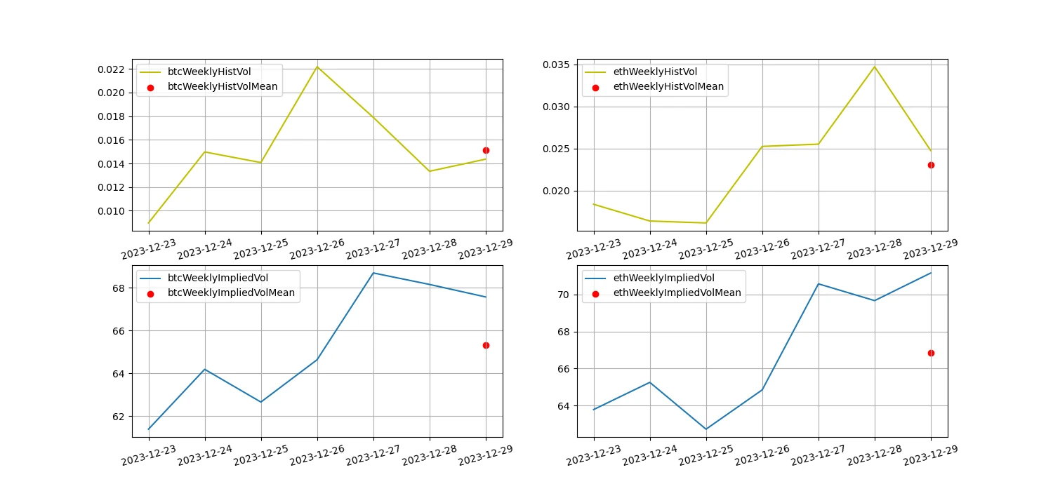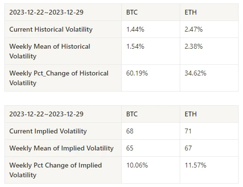 过去一周历史波动率 BTC 在 12.26 最高 ETH 在 28 号最高,隐含波动率整体上升。
