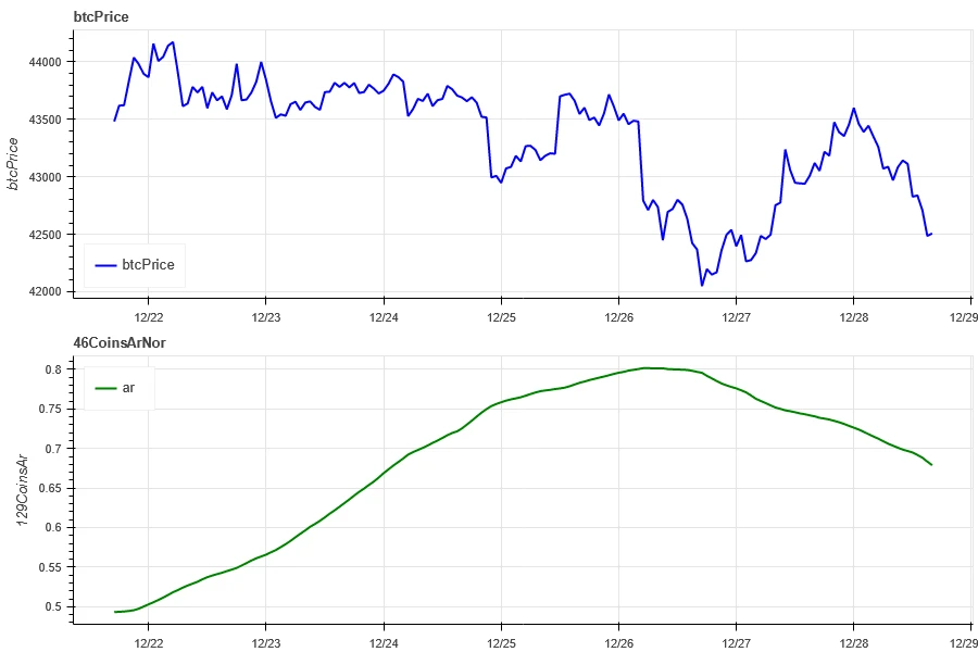 上图蓝色先为比特币价格,绿色线为['1000 floki', '1000 lunc', '1000 pepe', '1000 shib', '100 0x ec', '1inch', 'aave', 'ada', 'agix', 'algo', 'ankr', 'ant', 'ape', 'apt', 'arb', 'ar', 'astr', 'atom', 'audio', 'avax', 'axs', 'bal', 'band', 'bat', 'bch', 'bigtime', 'blur', 'bnb', 'btc', 'celo', 'cfx', 'chz', 'ckb', 'comp', 'crv', 'cvx', 'cyber', 'dash', 'dgb', 'doge', 'dot', 'dydx', 'egld', 'enj', 'ens', 'eos','etc', 'eth', 'fet', 'fil', 'flow', 'ftm', 'fxs', 'gala', 'gmt', 'gmx', 'grt', 'hbar', 'hot', 'icp', 'icx', 'imx', 'inj', 'iost', 'iotx', 'jasmy', 'kava', 'klay', 'ksm', 'ldo', 'link', 'loom', 'lpt', 'lqty', 'lrc', 'ltc', 'luna 2', 'magic', 'mana', 'matic', 'meme', 'mina', 'mkr', 'near', 'neo', 'ocean', 'one', 'ont', 'op', 'pendle', 'qnt', 'qtum', 'rndr', 'rose', 'rune', 'rvn', 'sand', 'sei', 'sfp', 'skl', 'snx', 'sol', 'ssv', 'stg', 'storj', 'stx', 'sui', 'sushi', 'sxp', 'theta', 'tia', 'trx', 't', 'uma', 'uni', 'vet', 'waves', 'wld', 'woo', 'xem', 'xlm', 'xmr', 'xrp', 'xtz', 'yfi', 'zec', 'zen', 'zil', 'zrx’]整体的相关性