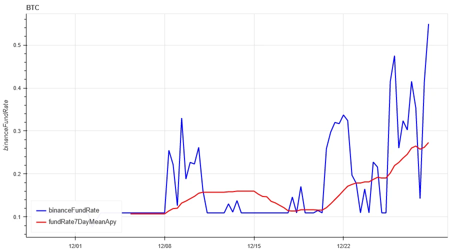 蓝色线为币安上 BTC 的资金费率,红色线为其 7 日平均