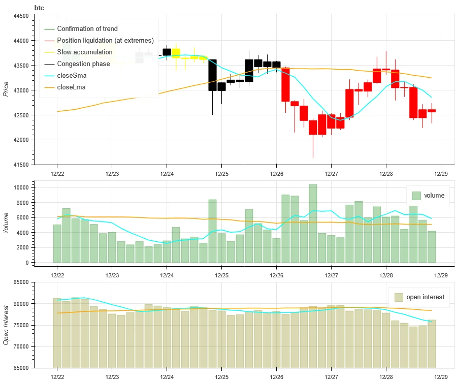 上图最上方 BTC 的价格走势,中间是成交量、最下方是未平仓量、浅蓝色是 1 天均值,橘色是 7 天均值。其中 K 线的颜色代表当前的状态,绿色是价格上升有成交量支持,红色是在平仓,黄色是在缓慢累积仓位,黑色是拥挤状态。