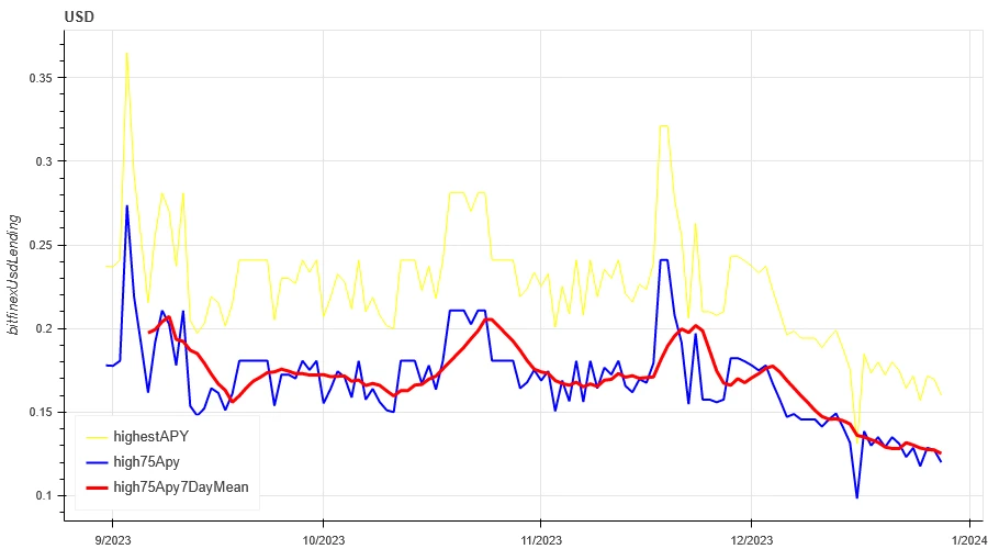 过去一周 USD 放贷年化收益平均为 12.6% ,利率持续下跌。