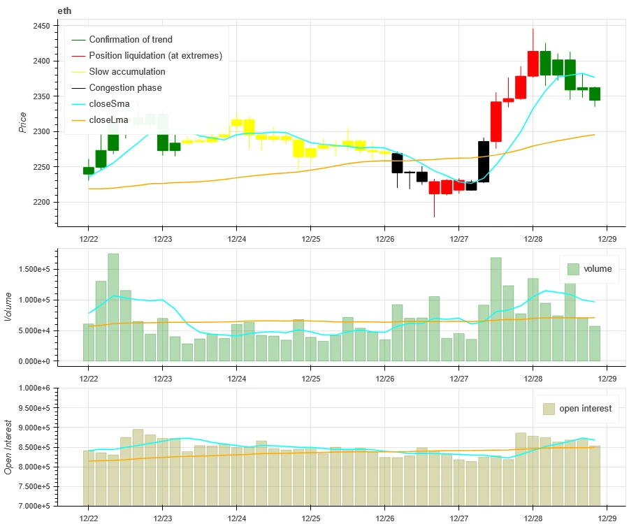 上图最上方 ETH 的价格走势,中间是成交量、最下方是未平仓量、浅蓝色是 1 天均值,橘色是 7 天均值。其中 K 线的颜色代表当前的状态,绿色是价格上升有成交量支持,红色是在平仓,黄色是在缓慢累积仓位,黑色是拥挤状态。