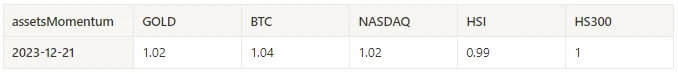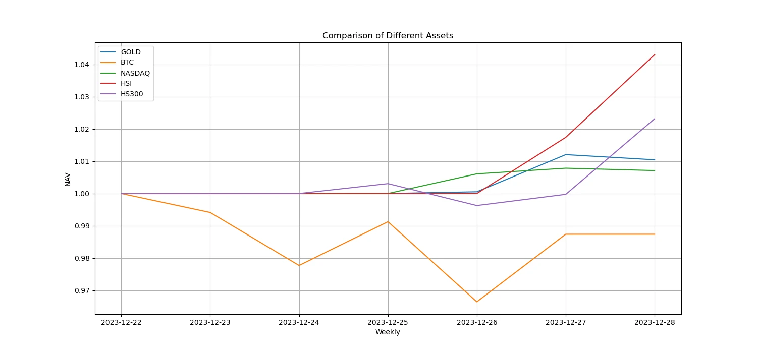 过去一周比特币/黄金/纳指/恒指/沪深 300 中,恒指最强势,而表现最差为比特币。