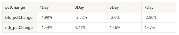 过去一周 BTC 价格下跌-2.96% ,ETH 价格上升 4.67% 。