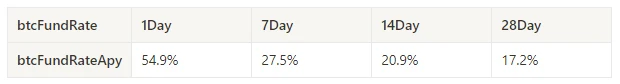 过去一周 BTC 资费平均年化收益为 27.5% ,最近一天合约杠杆情绪高涨。