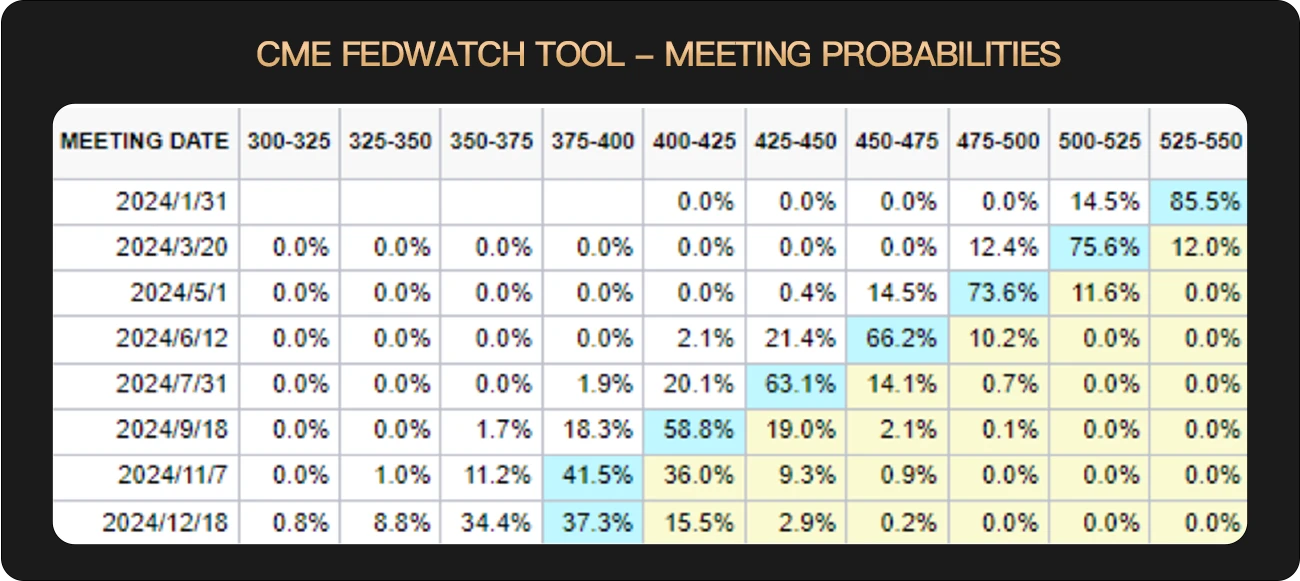 至于何时降息,根据 CME FedWatch 显示, 2024 年 3 月份降息至 5.25% 以下的概率达到 75.6% , 5 月利率重回“ 5 以下”的概率为 73.6% ,有 66.2% 的概率在上半年达到 4.5% 左右的利率水平。因此,目前市场还是比较乐观,认为上半年就可以实现显著降息的可能。