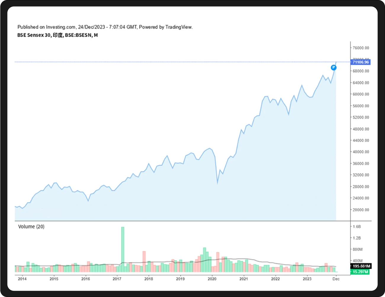 除美股外,印度股市可谓是近段日子的市场新星。印度孟买 Sensex 30 指数在 12 月 11 日突破 70000 点,目前已站稳 70000 ,突破 71000 ,成为全球第七大股市。