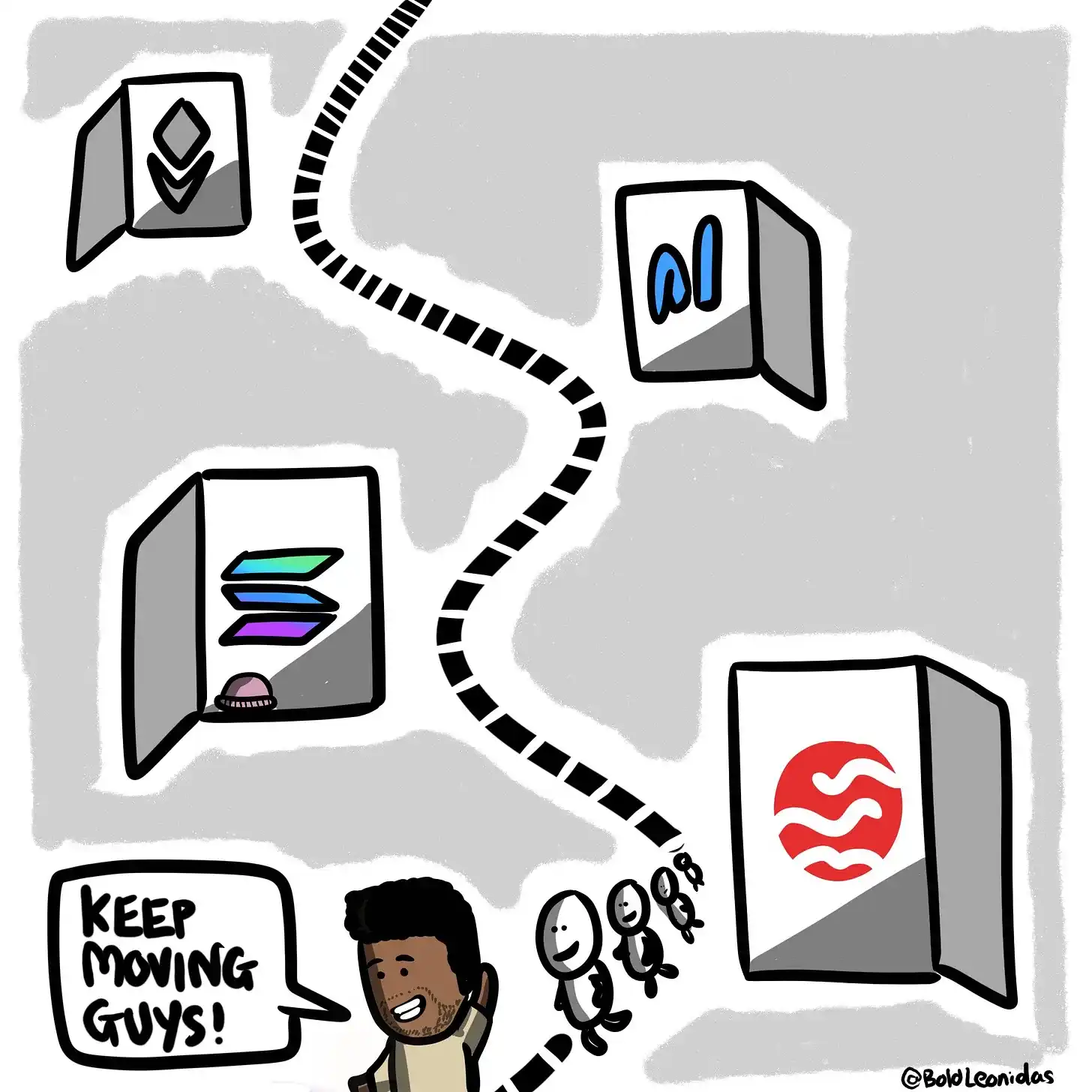 但在加密货币领域,这是很好的旧式 L1 轮换,就像 2020 至 2022 年牛市一样。这并不奇怪,因为启动上一次牛市的真正的零到一创新(DeFi 和 NFT)尚未到来,但这些创新即将到来。与此同时,我们将享受(重新)构建 L1 生态系统的乐趣。