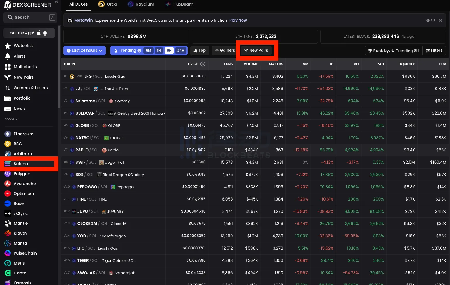 打开网站 DexScreener ,选择想要观察的公链,比如 Solana,接着选择 new pairs,找到近期新上线的热门土狗币交易对。观察非常热门但是市值较低的新代币,有机会找到比较好的「金狗」。