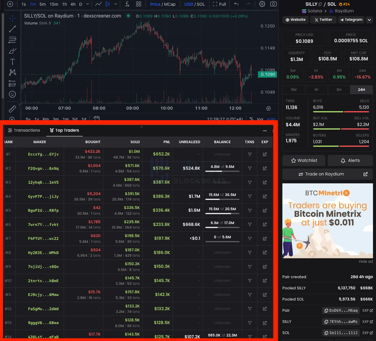 比如在$Silly 代币上,我们可以在 DexScreener 上切换到「Top Traders」标签,寻找盈利水平高的地址。点击过滤图标,查看这些地址的链上买卖记录,以便更好地理解其交易策略。