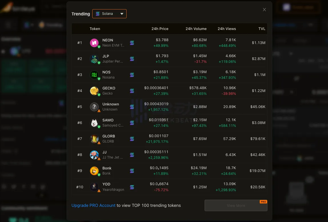 此外,Birdeye 上的热门 Trending 榜单也是一个不错的参考标准,用户可以交叉对比这三个数据看板网站的热榜,选择热度排名重合较高的 meme。