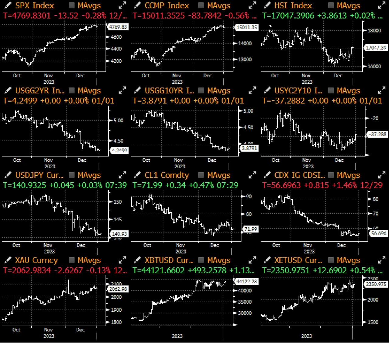 新年快乐!全球资产市场在明显的乐观情绪中进入了 2024 年,由于市场预计大多数已开发市场央行将出现一波降息潮,投资者几乎做多了所有资产类别(美元除外)。过去一年,市场让大多数宏观观察者都感到意外,风险资产在逆境之中攀升,尽管美联储的加息步伐前所未见,美国股市去年仍收在接近历史高点,再次证明宏观关系是相当复杂且不断变化的。