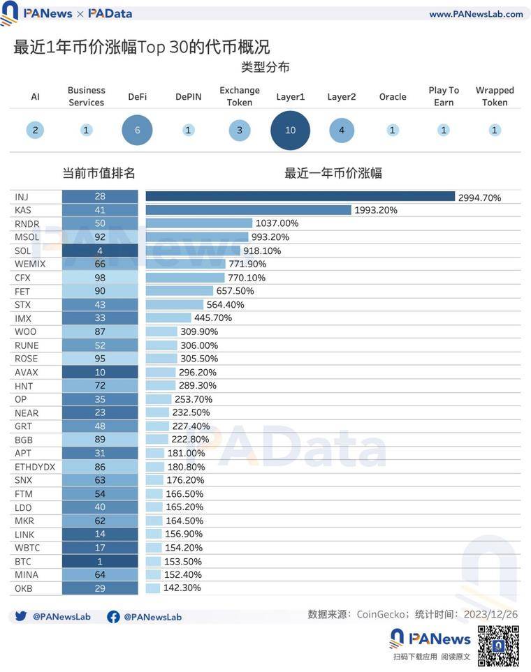 - 在市值前 100 的主流代币中,币价涨幅 Top 30 的代币平均涨幅达到 512.75%。其中,INJ 涨幅最高,超过了 2994%,KAS 和 RNDR 的涨幅超过 1000%。BTC 涨幅 153% 居第 28 位。