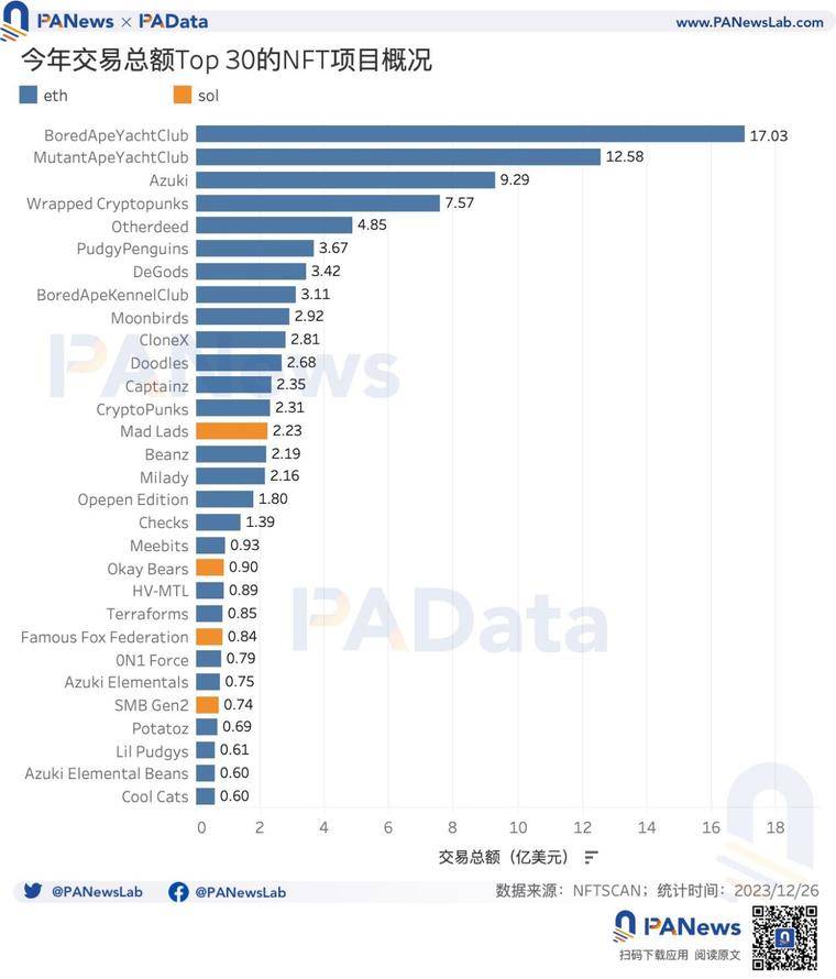 在市值排名前 100 的 NFT 项目中,今年 BAYC 是交易总额 Top 30(按 12 月 26 日的代币价格折算美元价格)最高的 NFT 项目,达到了 17.03 亿美元。其次是 MAYC,达到了 12.58 亿美元。其他项目的交易总额均不过 10 亿美元大关。