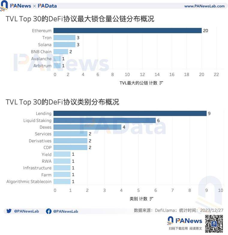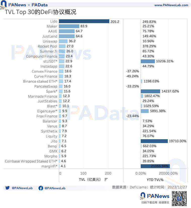03、Lido 的 TVL 超 205 亿美元居首,7 个新协议的 TVL 闯入 Top 30