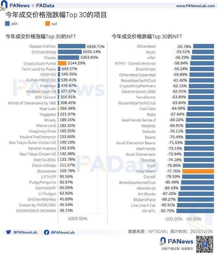 在 NFT 市值缩水的大背景下,仍然有一些项目涨势惊人。在实际成交价格涨幅 Top 30 中,Ethereum 上的 Opepen Edition、OnChainShiba、Checks 的涨幅最高,分别在 6969%、6035% 和 5363% 左右。其次,Solana 上的 Crypto Duck Punkz 也上涨较多,实际成交价涨幅超过了 2144%。