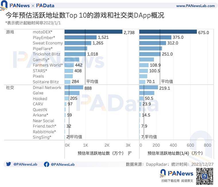 除了 DeFi 和 NFT 以外,2023 年游戏和社交领域的 DApp 也备受关注。根据 DappRadar 的数据进行预估(年预估活跃地址数=最近 30 天日均活跃地址 *365),结果显示,游戏类预估年活跃地址数 Top 10 的项目包括 motoDEX、PlayEmber、Sweat Economy、PipeFlare、Trickshot Blitz、Gamifly、Farmers World、5TARS、Pixels 和 Solitaire Blitz。社交类预估活跃地址数 Top 10 的项目包括 Dmail Network、Galxe、Hooked、CARV、QuestN、Arkana、Near Social、Friend.tech、RabbitHole 和 SingSing。