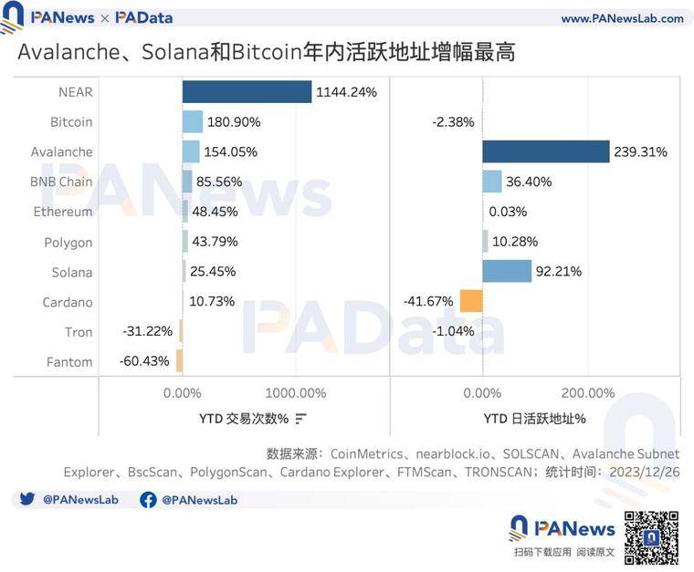 日交易次数增幅最高的则是 NEAR,超过了 1144%。其次,Bitcoin 和 Avalanche 的日交易次数增幅也超过了 100%,这或都受到年末铭文热潮的影响。另外,Ethereum 今年的日交易次数增长了 48% 以上,Solana 的日交易次数增长了 25% 以上。总体而言,大多数公链的日交易次数都呈现增长趋势。
