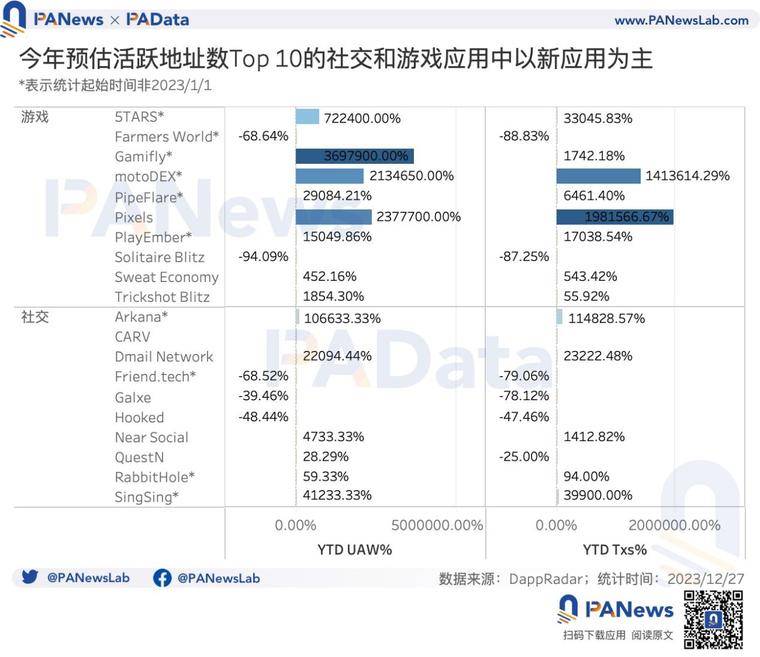 除此之外,新项目上线并完成冷启动,也是造成年活跃地址增幅和年交易次数增幅都特别高的原因之一。比如,游戏中的 Gamifly 和 5TARS;社交中的 Arkana 和 RabbitHole。