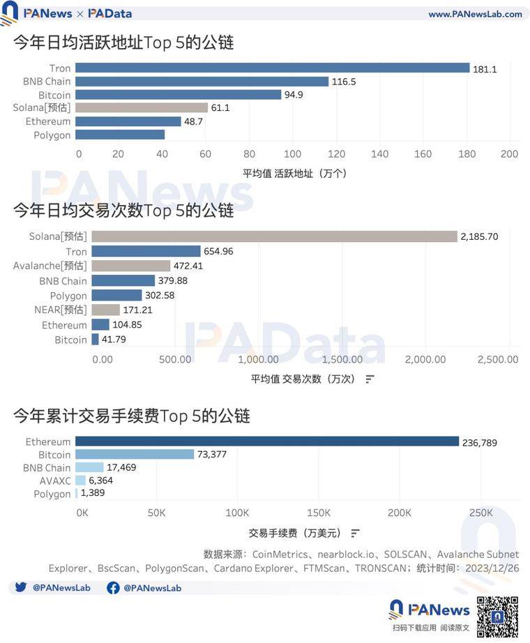 02、Avalanche 和 Solana 年活跃地址增幅明显,Ethereum 年交易手续费仍然最高