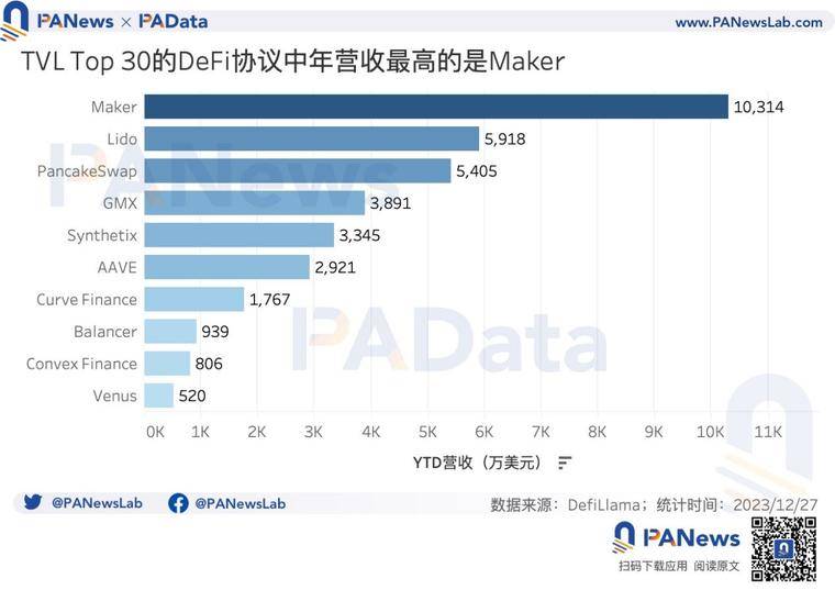 从营收(Revenue)来看,在 TVL Top 30 的协议中,Maker 的年营收最高,达到了 1.03 亿美元,其次是 Lido 和 PancakeSwap,都超过了 5000 万美元。另外,GMX、Synthetix 和 AAVE 的营收也都超过了 1500 万美元。