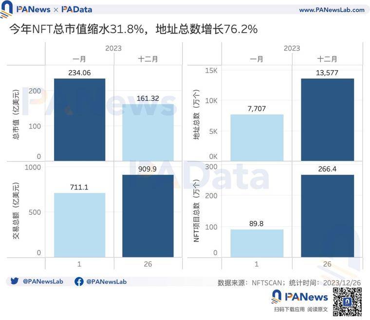 2023 年 NFT 市场遇冷,根据 NFTSCAN 的数据,Ethereum、Solana、Polygon 和 BNB Chain 四条链上的 NFT 的总市值从 234 亿美元缩水至 161 亿美元,跌幅约为 31.08%。