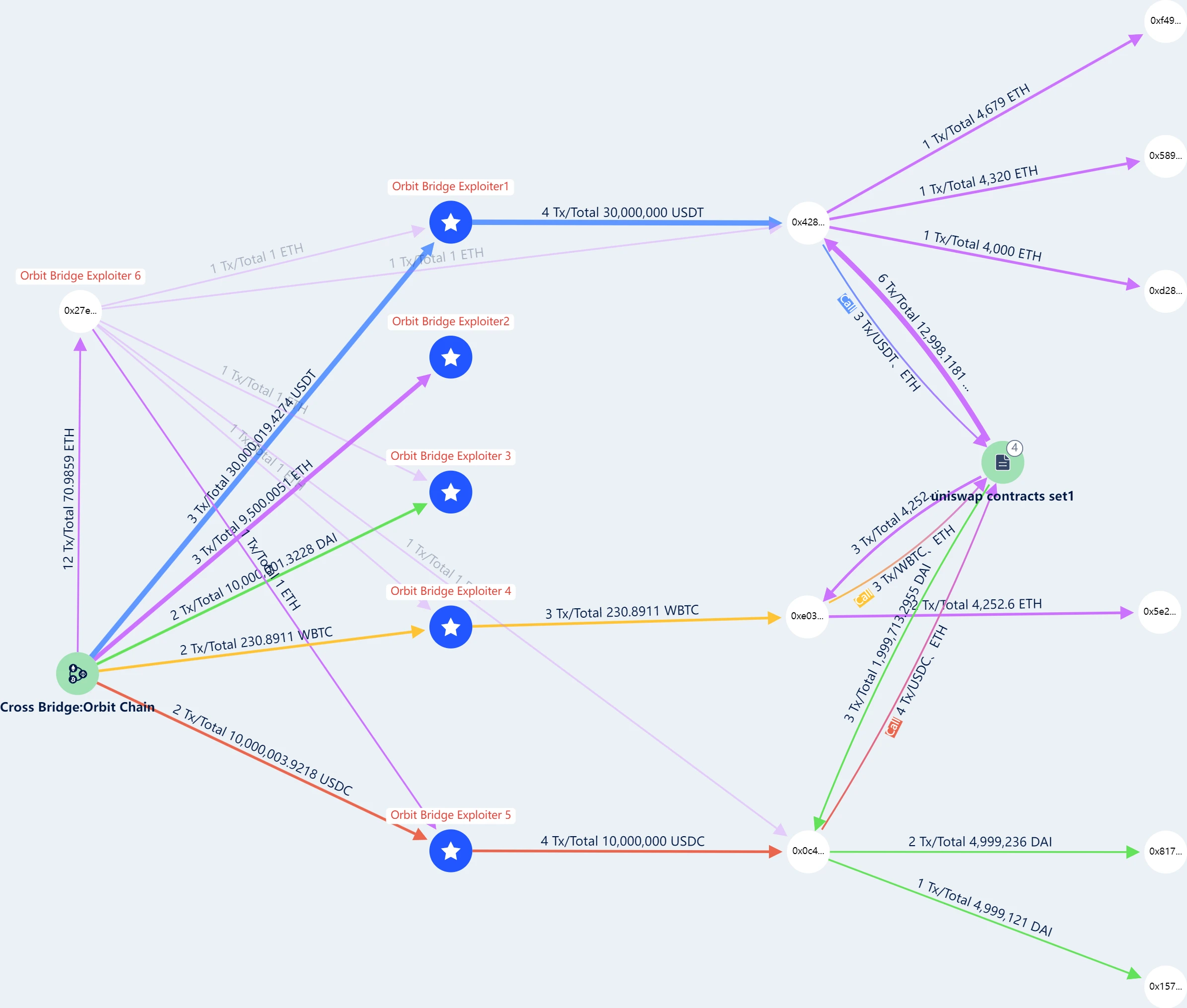 截止发稿,被盗资金转移情况如下图所示 ,黑客正式发起攻击后,将被盗资金转移到上述五个地址。在五笔独立的交易中,每笔交易都发送到一个新的钱包,Orbit Bridge 发送了 5000 万美元的稳定币(3000 万 Tether 、 1000 万 DAI 和 1000 万 USDC)、 231 枚 wBTC(约 1000 万美元)和 9500 枚 ETH(约 2150 万美元)。
