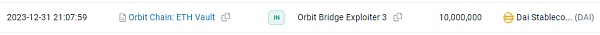 其余数个黑客地址在2023-12-31 9:00 PM +UTC先后对Orbit_Chain项目的DAI、WBTC、ETH、USDC、USDT进行了攻击。