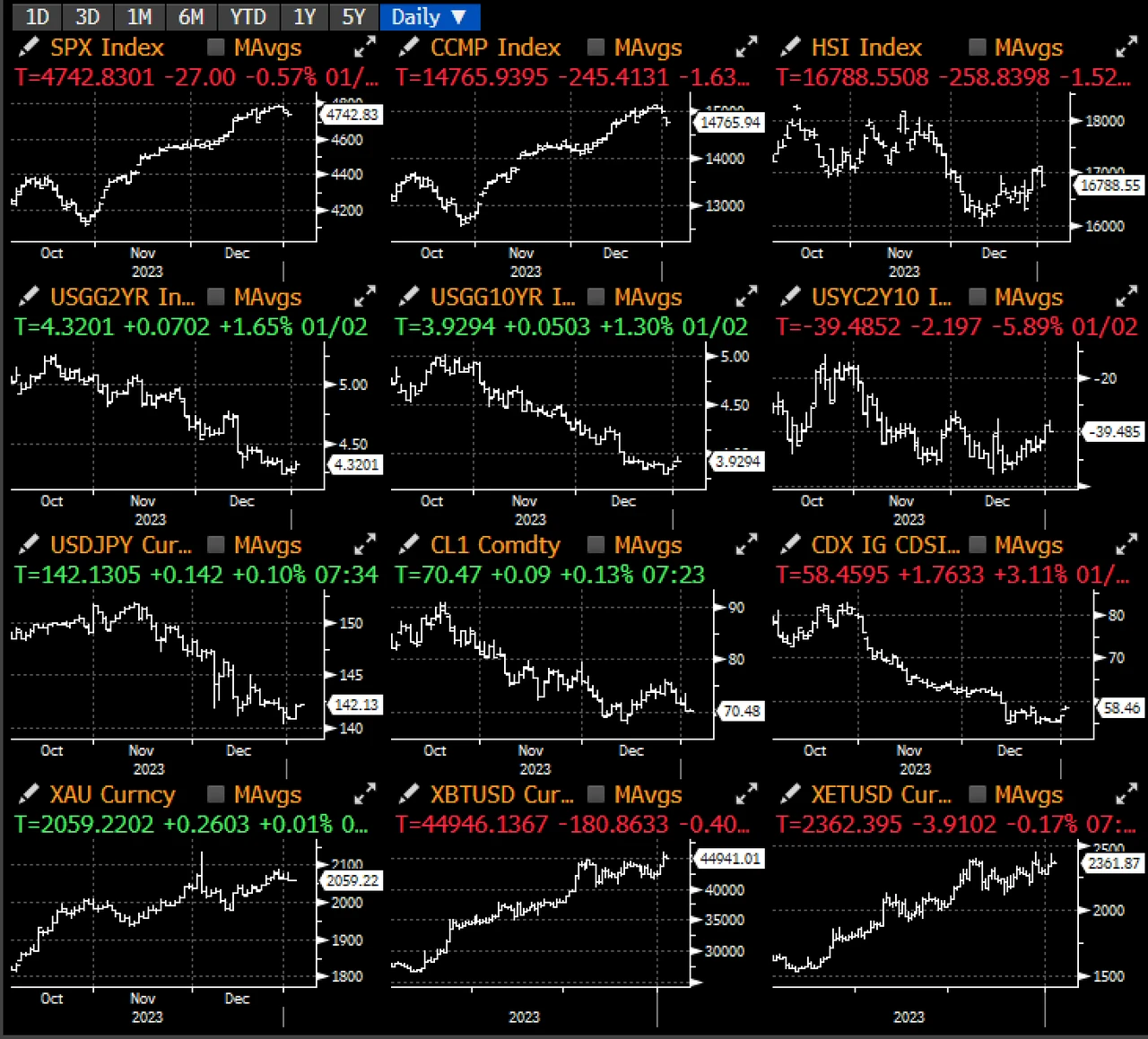 2024 年首个交易日的主题是去风险 ,虽然日本仍在假期中,但固定收益市场非常活跃(交易量超过 30 天平均交易量的 2 倍),风险资产全线下跌,债券收益率全面跃升 6 个基点,Nasdaq 指数下跌 1.6% ,油价下跌约 2% ,美元相对大多数货币走强,市场预测美联储 3 月开始实施宽松政策的可能性从上周的 85% 降至 75% ,而截至 6 月的隐含降息幅度则降至 72 个基点,最高时为 83 个基点。