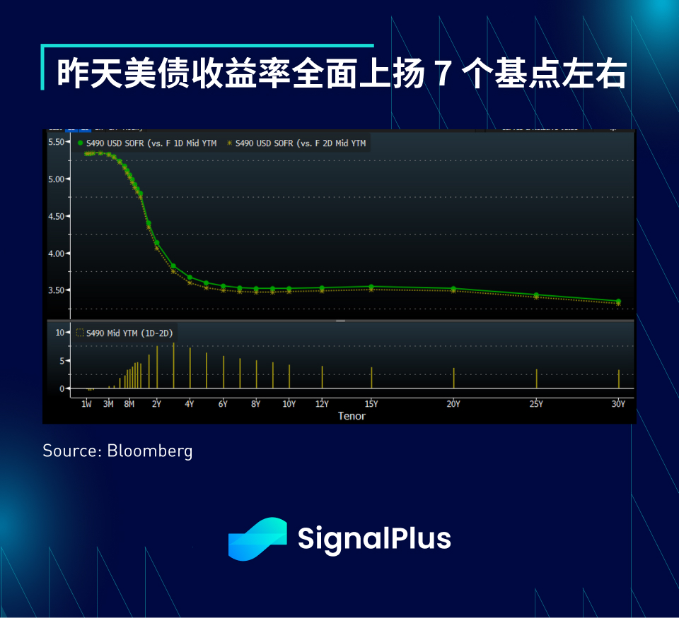 企业抓住收益率暂时下降和场外新资本的机会,债券供应如预期地大幅回升,投资等级债券发行超过 17 笔,总供应量超过 290 亿美元;此外,最新的国库借款估计为 1, 500-1, 750 亿美元,进一步加剧了供应消化的问题,使得 10 年期美债收益率在熊陡走势中回到近 4% 的水平。