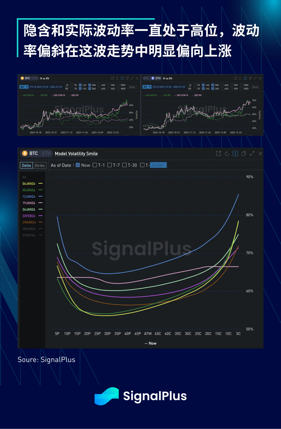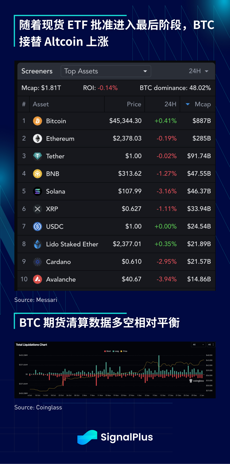 在加密货币方面,BTC 自 2022 年底以来首次突破 4.5 万美元,不过包括 Solana 、 Avalanche 和 Ripple 在内的主流 altcoins 在过去 24 小时内下跌了约 3% ,除了对 ETF 批准的期待即将达到高潮之外,市场没有什么新消息,BTC 期货清算数据在多空双方都相对平衡,隐含和实际波动率则在这波走势中保持在较高水平,预计即使在批准宣布后也有机会继续保持高位,波动率偏斜则明显偏向于上涨。