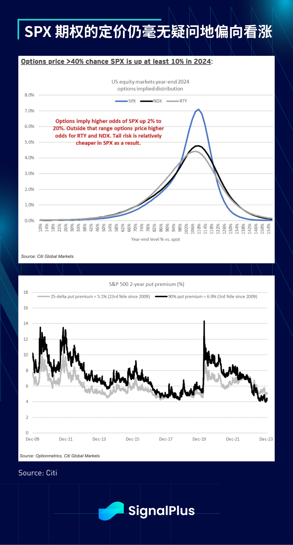 虽然市场有些动荡,但股票投资者仍处于看涨状态,根据期权隐含价格分布,市场认为 SPX 在 2024 年上涨超过 10% 的可能性有 40% 以上,而 2 年期 25 Delta 看跌期权权利金则处于近 20 年来最便宜的水平,显示市场对下行保护不感兴趣。