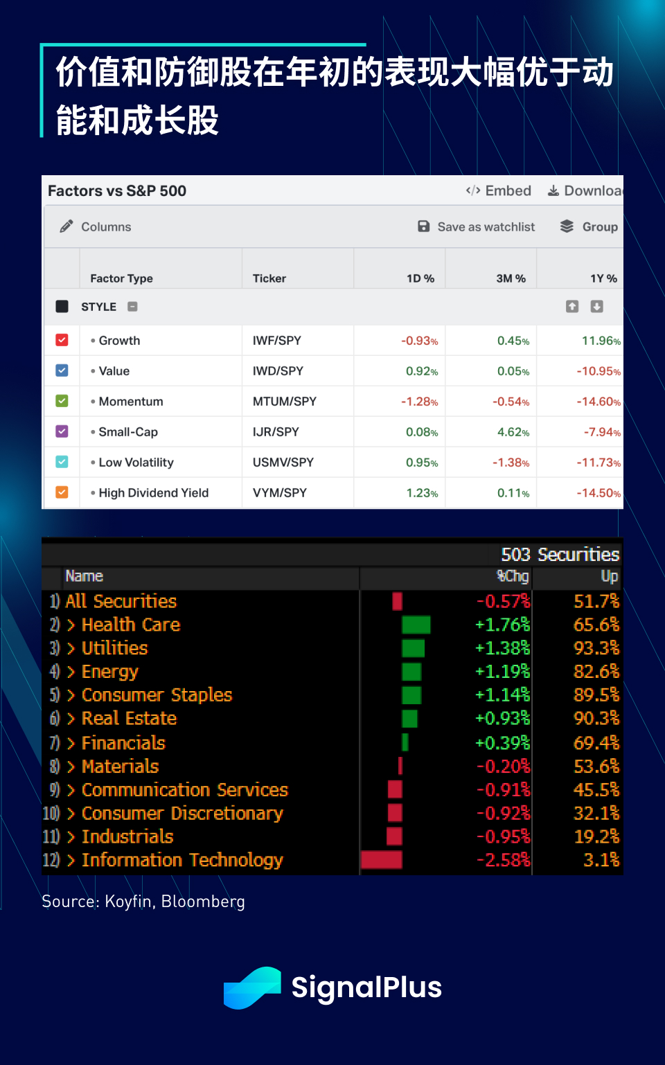 交易员在年初仍保持谨慎,股市同样全线疲软,价值和防御股 + 1% ,表现相对优异,动能和科技股则分别下跌了 1.5% 和 2.5% ,大宗商品市场也全面下跌约 1% ,不过抗通胀资产表现相对较好(5 年期通胀掉期上升 4 个基点),投资者可能会针对即将发布的就业数据(工资增长)和 CPI 数据寻求上行保护。