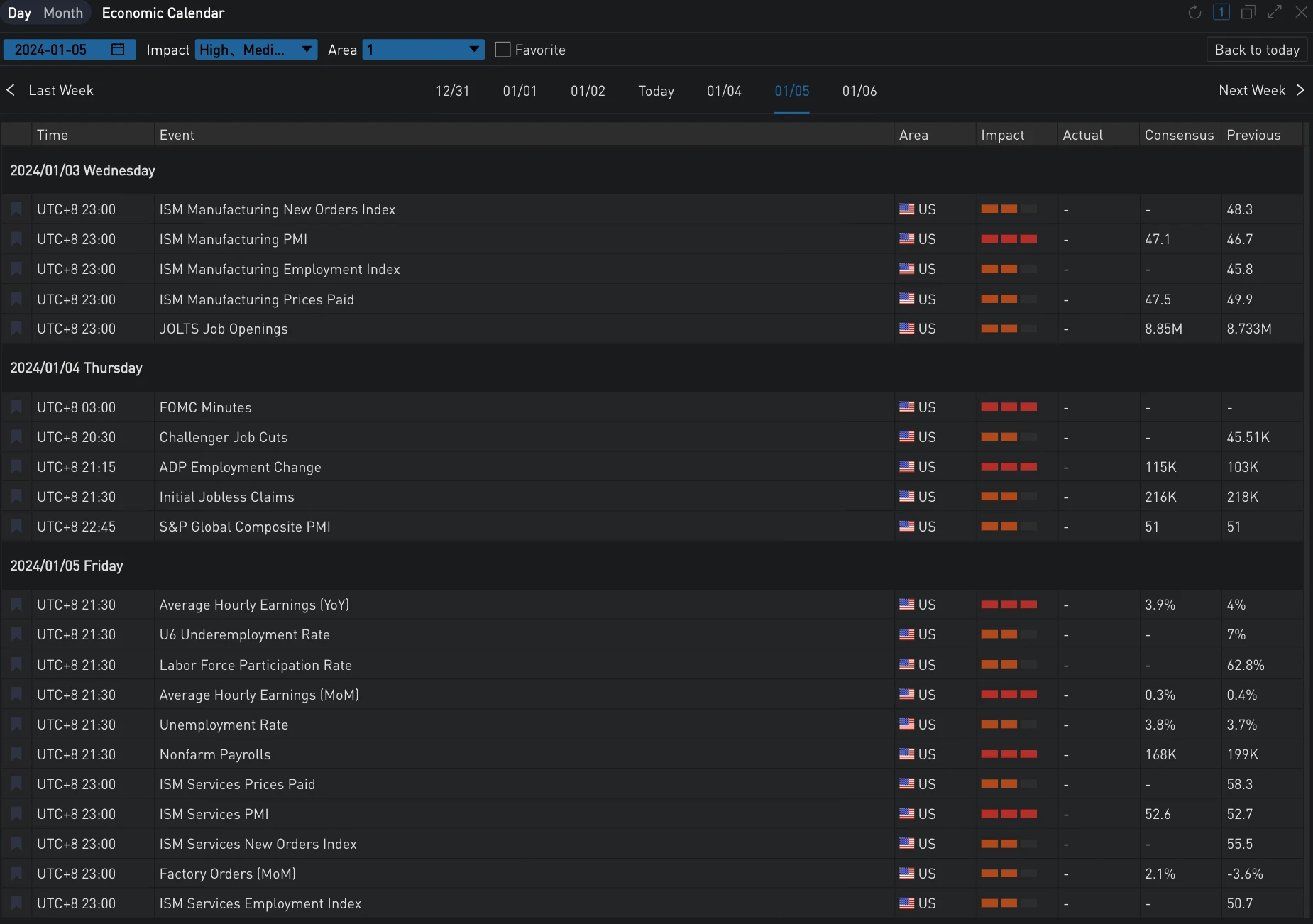 昨日(2 JAN)交易员对美联储降息的信息有所动摇, 3 月开始实施宽松政策的可能性从上周的 85% 降至 75% ,同时减少了对降息幅度的押注,预计今年累计降息幅度不会超过 150 个基点;固定收益市场交易活跃,美债收益率全线上涨,十年期收益率现报 3.976% ,创两周新高,两年期收益率报 4.347% 。美股方面,因遭到巴克莱下调评级的影响,苹果及一众芯片股均出现跌势,加之市场对美联储降息预期的削减,三大股指走势分化,其中道指平收(+ 0.07% ),纳指和标普 500 分别收跌 1.6% /0.57% 。另一方面,美国 12 月 Markit 制造业 PMI 录得 47.9 ,低于预期的 48.4 ,据金十报道,标普全球发文表示:随着美国制造业订单数量以更快的速度下降,产出再次收缩,且制造业就业人数下降速度为 2020 年 6 月来最快。本周将是数据发布相对密集,将包括周三的 ISM,JOLTS,周四的初请失业金人数,以及周五的 ISM 服务业和非农就业数据等。