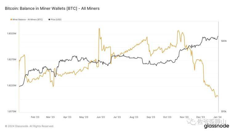 但是在贝莱德等资管巨头面前,整个加密市场万亿级的规模就不够看了。比特币矿工虽然表面不说,但是从持币数据走势来看,近两月都是在不断抛售中度过。这虽然有 ETF 逾期通过,利好出尽价格下跌的担忧,但是从长期来看,矿工已经意识到问题。