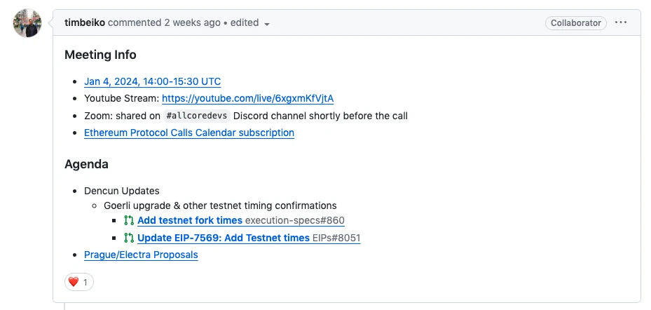 本次 ACDE #178 的主持人并不是我们所熟悉的核心开发者 Tim Beiko (其将在 ACDE #179 回归主持),而是由 Geth 团队开发者 lightclient 代为主持,根据 lightclient 今日早间所作出的会议纪要,昨晚开发者们已就 Dencun 升级的测试网时间安排达成了共识。