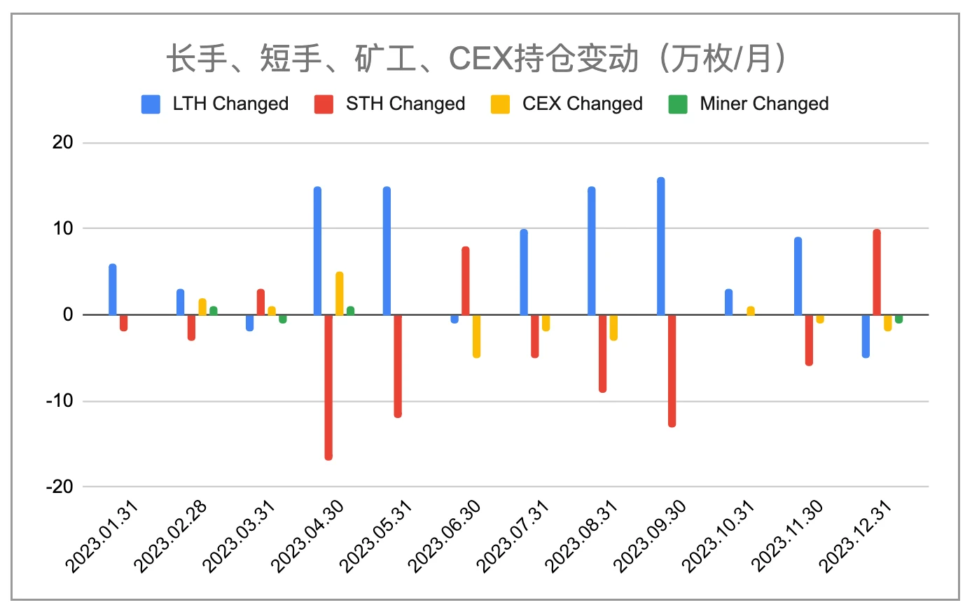 从 1 月到 11 月,长手都在进行积累,而短手在持续卖出。在这 11 个月里,长手收集了 80 万枚 BTC,而短手减持了 56 万枚,CEX 流出 2 万枚,矿工增持 1 万枚。