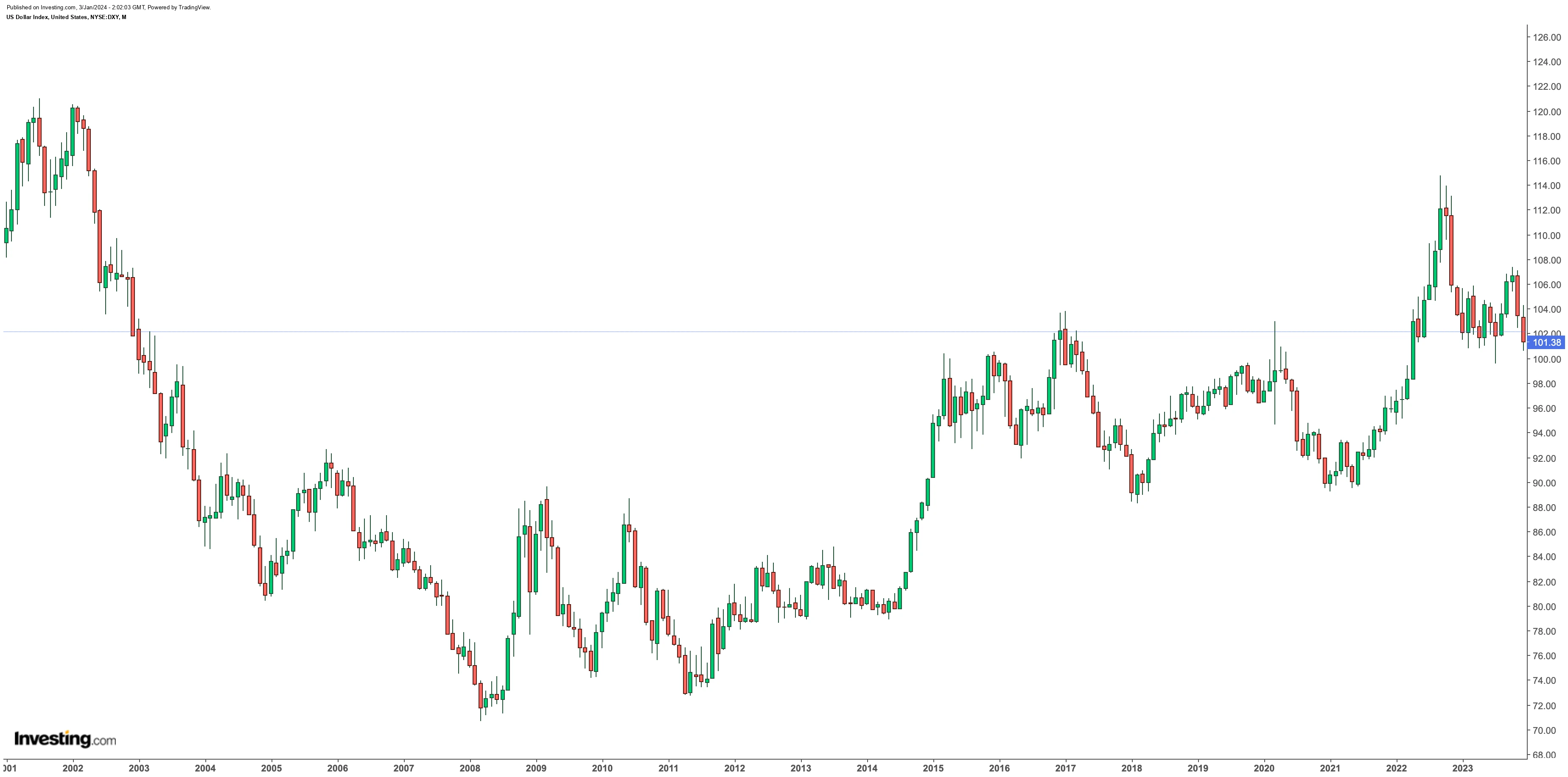 对应之下,美元指数全年盘整,并在 11 月 12 月加息停止降息预期启动之后开始加速下行,后市料降持续下行。