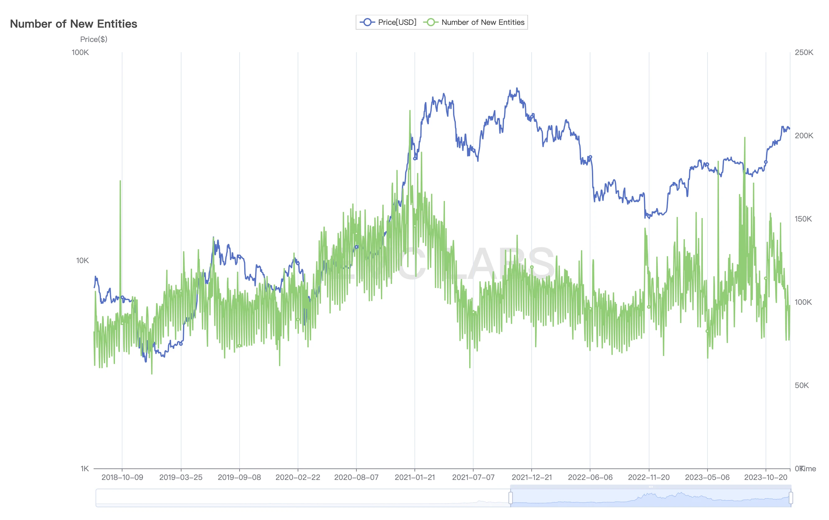 依照历史数据,从修复期到上升期转换过程中,必然伴随比特网络的用户的增长和链上行为的繁荣。因为 Ordinals BRC 20 MEME 币的热潮,数据被污染,用户行为被影响,提升了我们的观察难度。