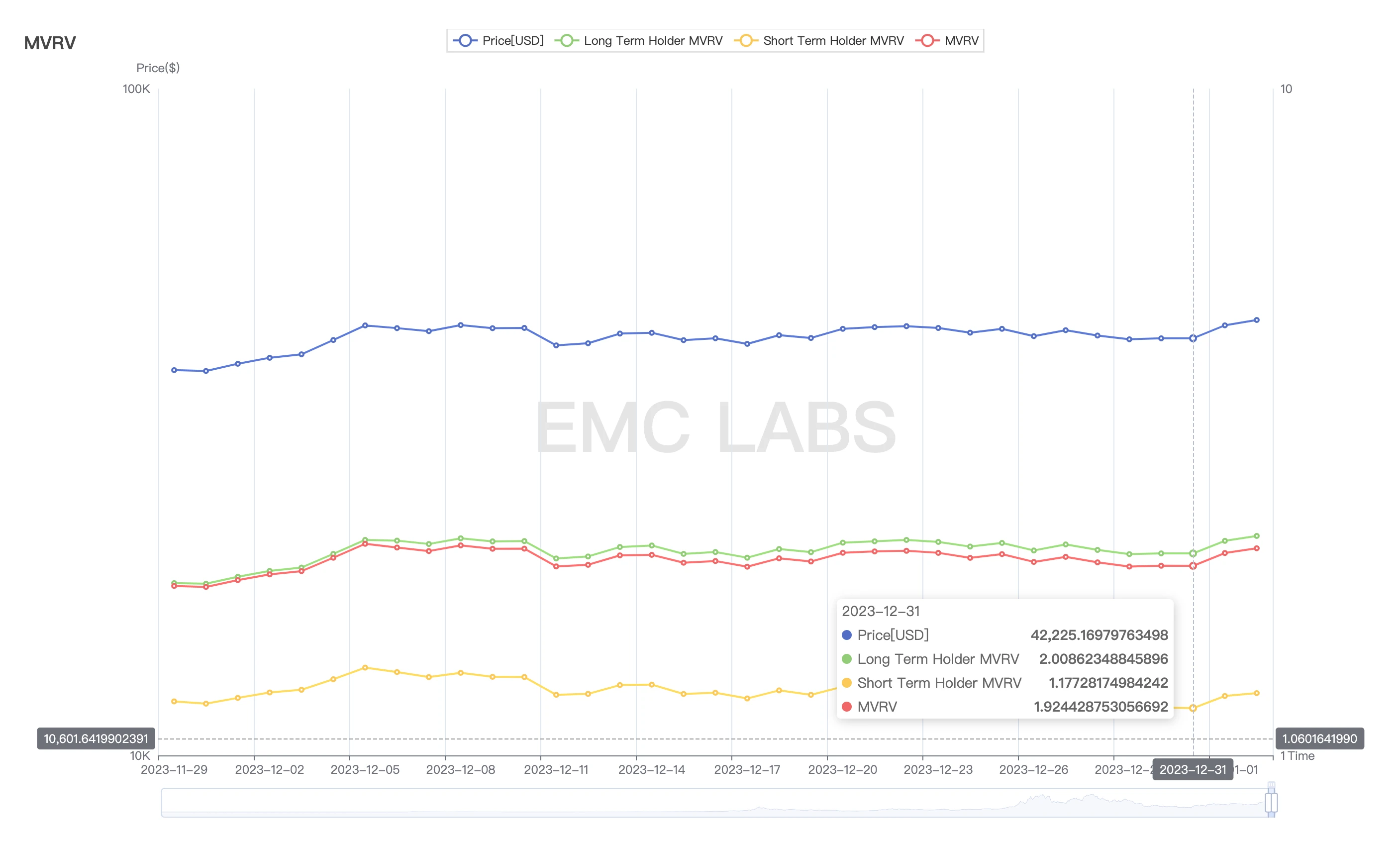 随着 12 月初 BTC 价格的急速抬升,全市场盈利比从 11 月底的 1.79 涨至 1.92 ,其中长手(长期投资者群体)由 1.8 升至 2.0 ,短期投资者群体由 1.2 降至 1.18 。