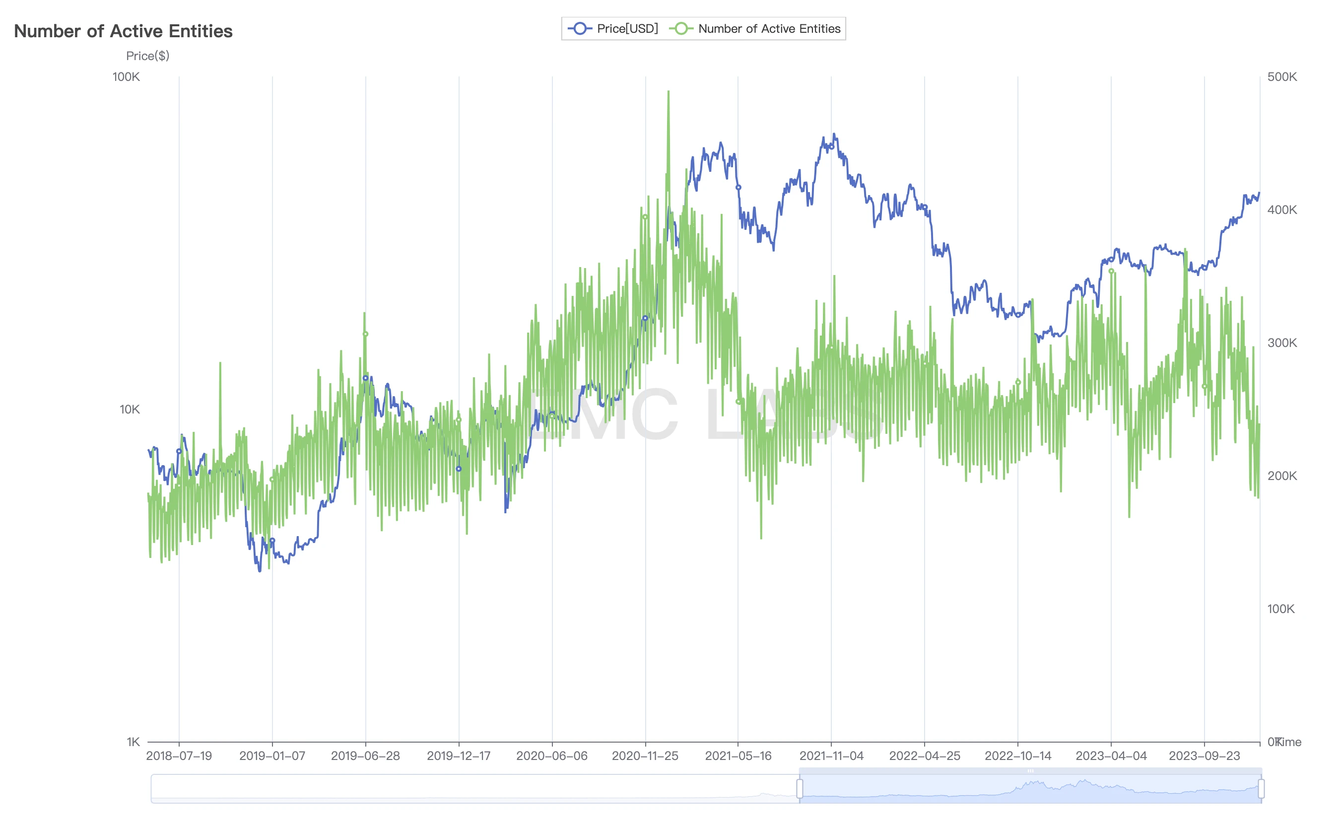 2023 年,整体上链上数据是在提升的,但在 12 月的确出现了巨大的回撤,这使得 BTC 在本月的上涨显得底气不足。后继,我们将透过数据持续关注链上行为的演变,这是牛市启动的根本。这一维度数据的下降,市场不堪承受。