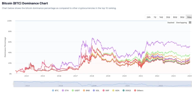 其次, Bitcoin Dominance 持续保持高位, 仍然是加密市场的基石。比特币占加密资产总市值的 47% 。虽然这个比例会随着其他加密资产的崛起而波动,但比特币依旧保持着市场领导者的地位。