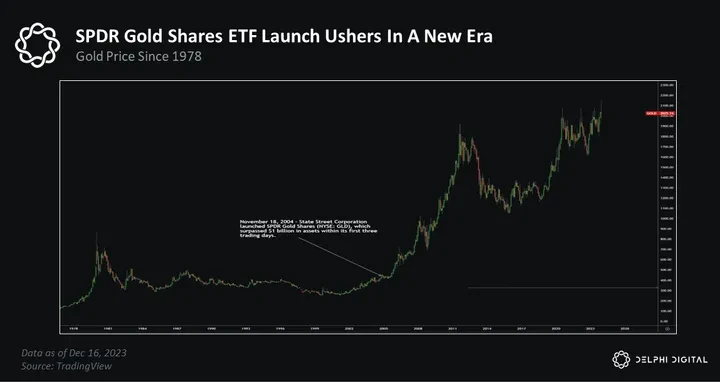 参考黄金 ETF , 2004 年 11 月推出的美国第一只黄金 ETF——SPDR Gold Shares (GLD),在短短三天内就积累了超过 10 亿美元的资产。在成立的第一年,GLD 的管理资产 (AUM) 飙升至超过 30 亿美元。截至 2023 年,全球黄金 ETF 的资产管理规模约为 1, 500 亿美元,这表明这些投资工具对黄金市场产生了深远的长期影响。