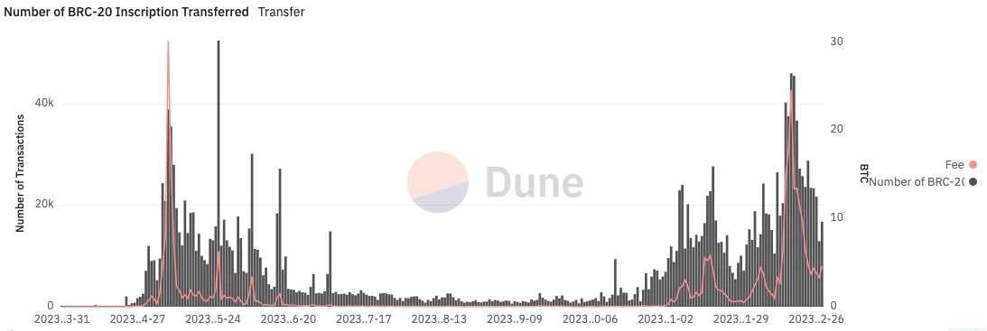 BRC 20 : 累计 BRC-20 转账数量超过 45.4 million, BRC-20 累计产生的手续费超过 4, 290 BTC;