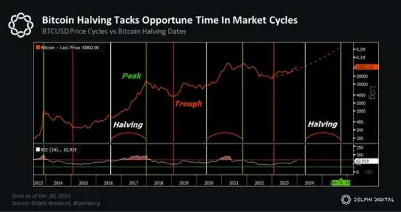 比特币 2023 年 YTD 价格上涨了超过 150% ,市场对于比特币的乐观情绪已经开始体现在价格中。以 2024 年 4 月的减半上升趋势可能会延续,甚至加速。