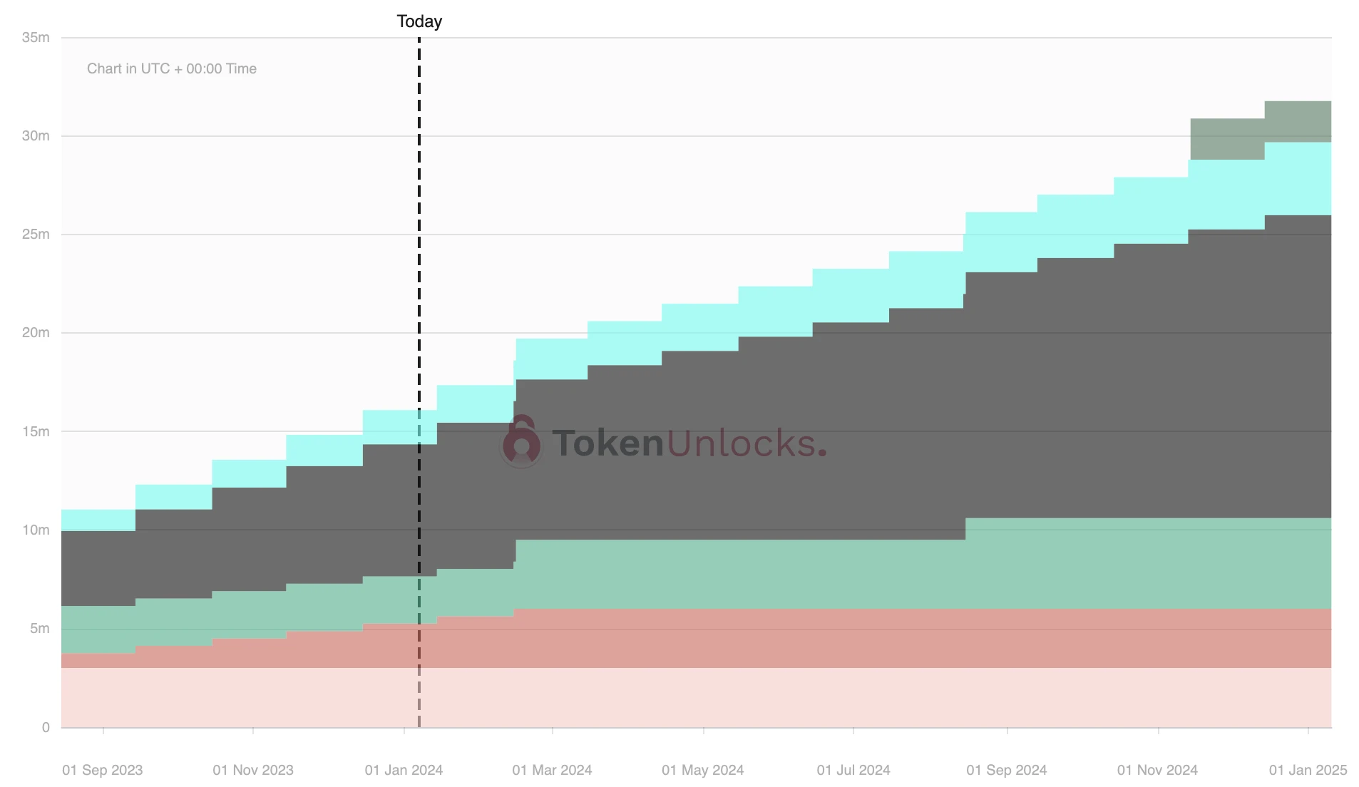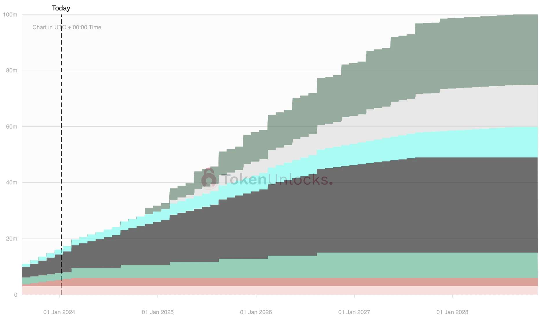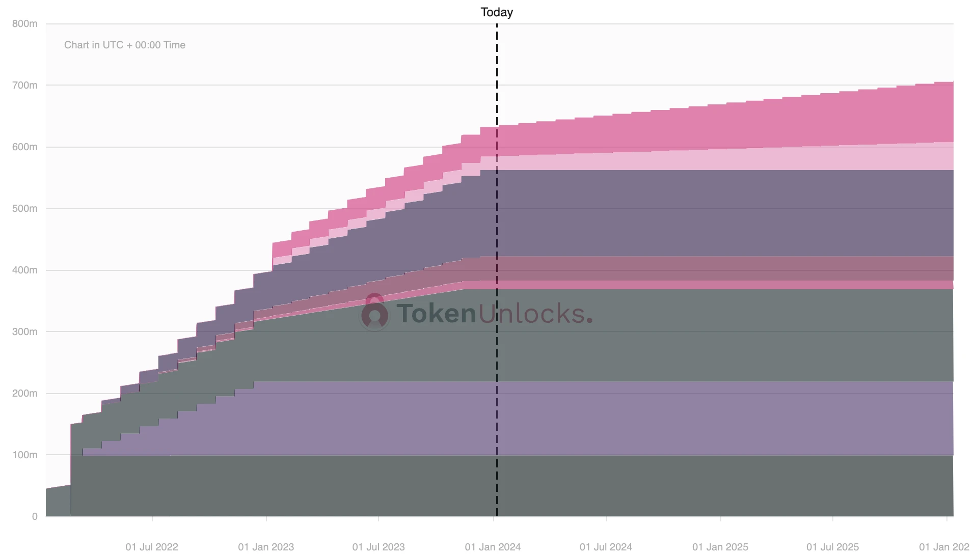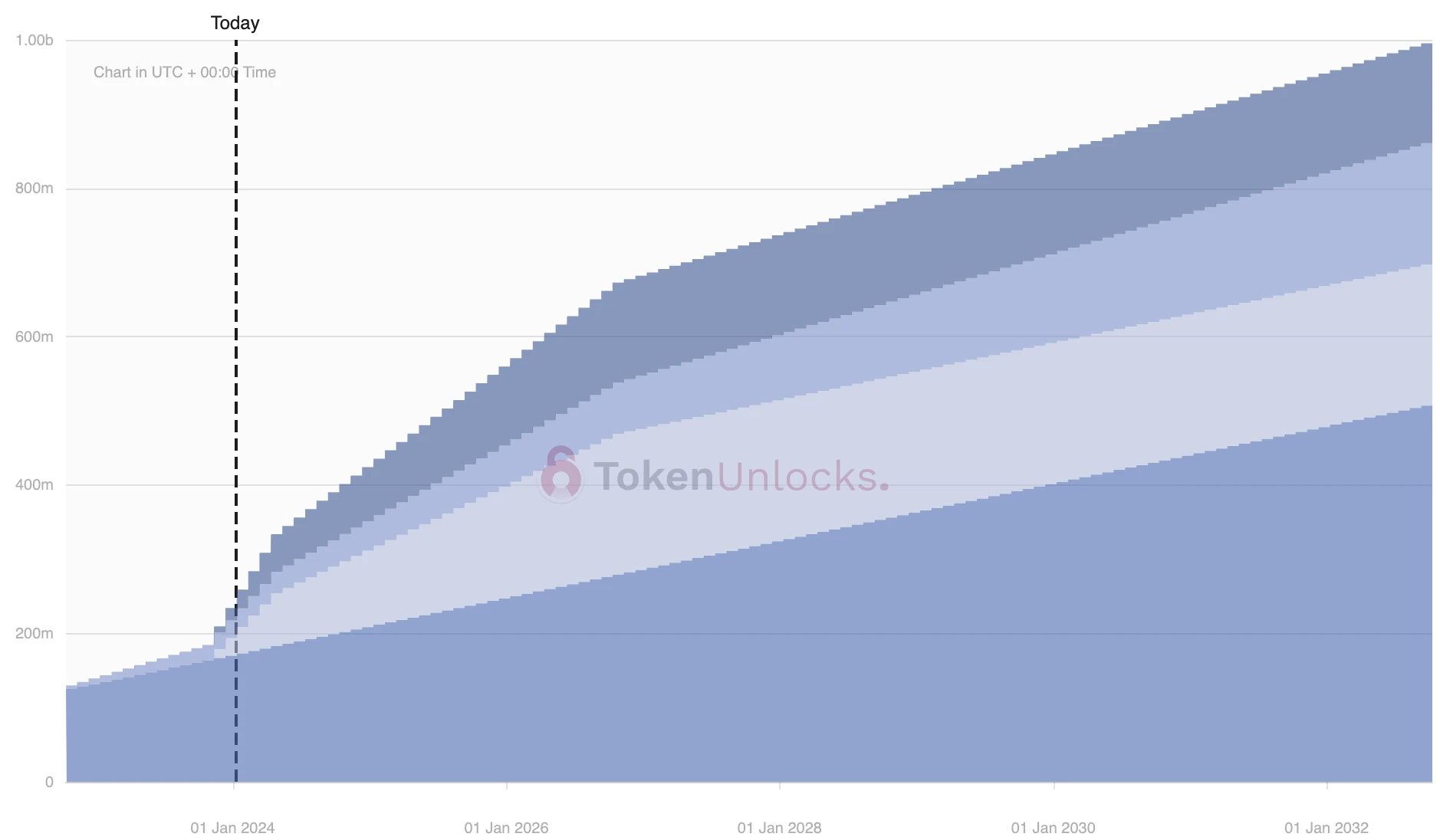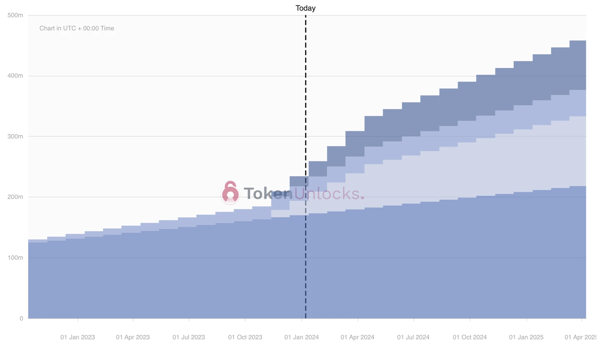 若观察其近年解锁则可发现,APT 此前每月均有相似量级的代币解锁。而在近两月以来,解锁规模较以往更为庞大。